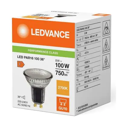 Puoi risparmiare fino al 90% tra il risparmio di energia e I costi di mantenimento grazie al basso consume di soli 8W e la lunga vita media utile di 15000 ore, comparandola invece con una lampada alogena GU10 con la sola durata di 2.000 ore. Inoltre le lampade LED non producono raggi IR e raggi UV dannosi per noi esseri umani tutto questo senza neanche produrre calore! Installarla è veramente semplice: ruotare la vecchia lampada GU10 di un quarto e rimuoverla dall’attacco. Successivamente inserire la lampada LED GU10 nell’attacco e girarla di un quarto per installarla. Questa è lampada di alta qualità Ledvance e parte da un prezzo di . Puoi usare questo prodotto come desideri grazie alla nostra garanzia totale di3 anni da Lampadadiretta.it.