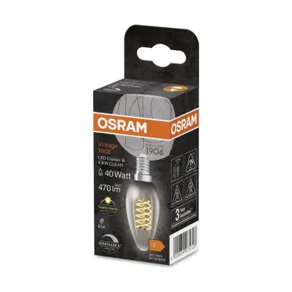 La lampada Osram Vintage 1906 LED Classic Slim E14 Candela Filamento Chiara 4.8W 470lm - 827 Bianco Molto Caldo | Dimmerabile - Sostitutiva 40W è il sostituto perfetto per le tue vecchie lampade 40W con attacco a vite piccolo E14 grazie alla sua tecnologia LED. Passare a LED ti offrirà molti vantaggi!