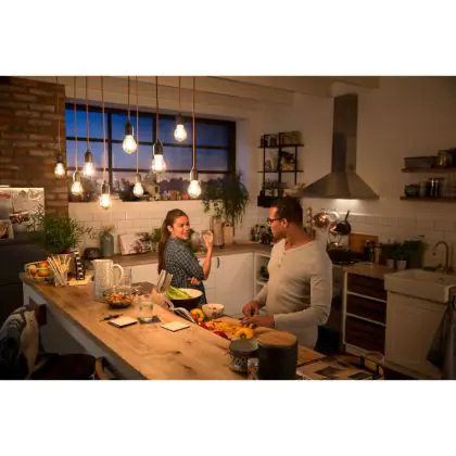 A differenza delle lampadine dimmerabili convenzionali, questa lampadina consente di regolare oltre all’intensità luminosa anche la temperatura di colore, passando da una tonalità di 2200 fino a 2700K. Quindi sarà possibile godere di tre impostazioni luminose con una sola lampadina. Leggi tutti i vantaggi di Philips DimTone qui.