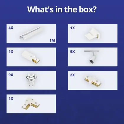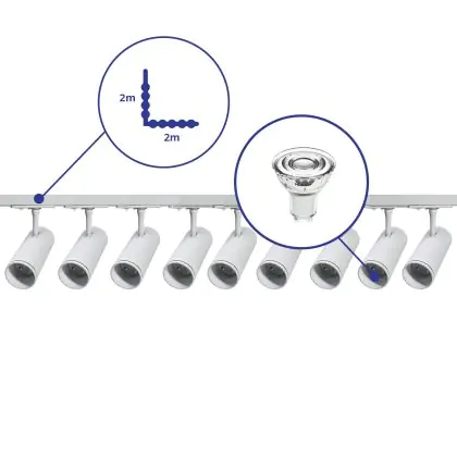 Descrizione Set completo 1-Fase Rail L 2 x 2 Metro Bianca | incl. 9x Faretti + GU10 2700K 3W Dimmerabile + Tappo Di Chiusura, Connettore di Alimentazione e L -Connettore